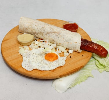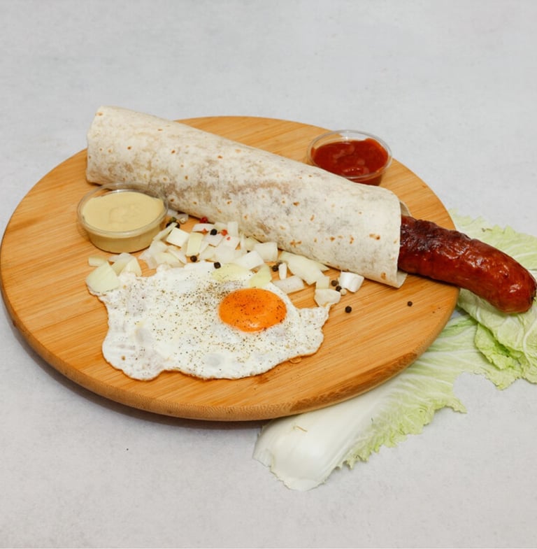 Całość zawinięta w podpłomyk, który łączy w sobie smaki charakterystyczne dla tradycyjnych polskich śniadań lub obiadów – kiełbasa, jajka i świeża surówka to klasyka w nowoczesnej formie.
